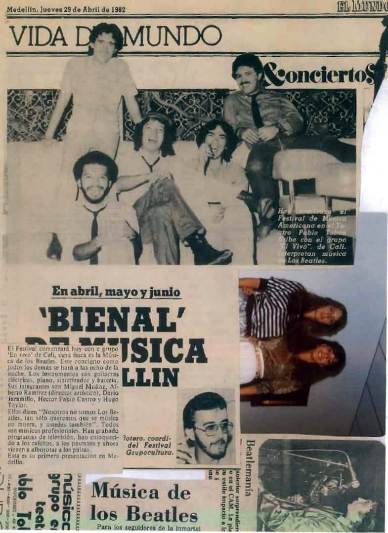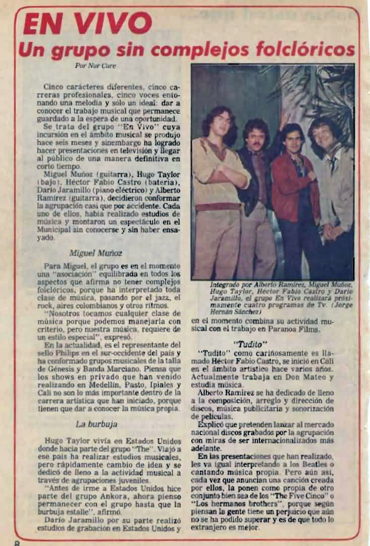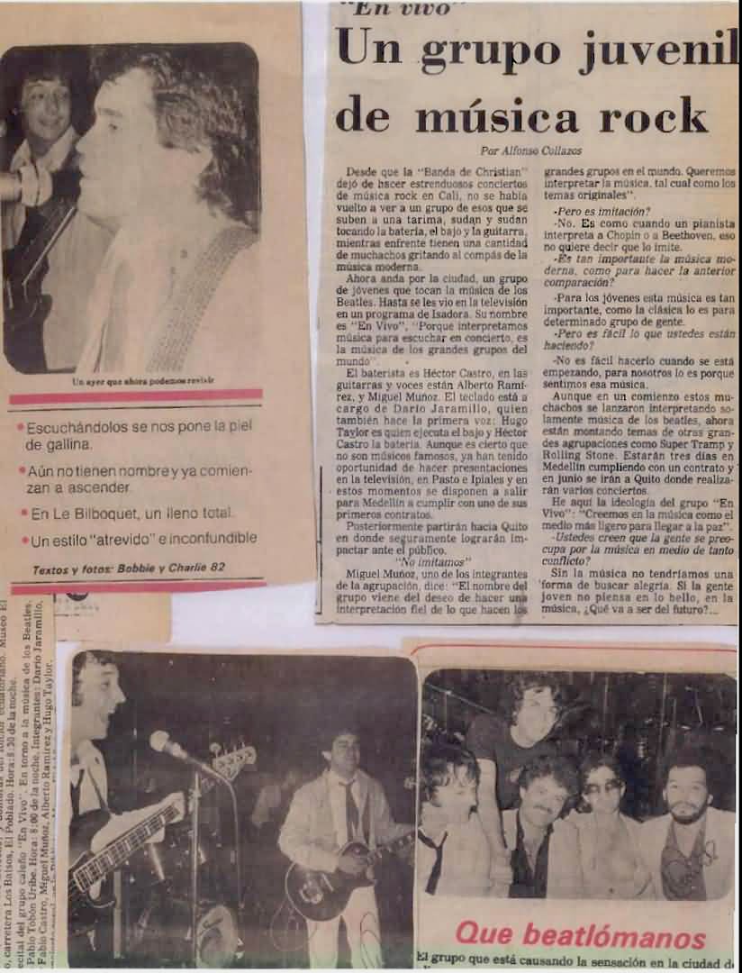 Back to EnVivo Main PageThese historic photographs capture EnVivo during their memorable performances and press coverage across Colombia in the early 1980s. From intimate venue shows at Le Bilboquet to major press features in El Occidente, these images document a significant era in Colombian rock history.